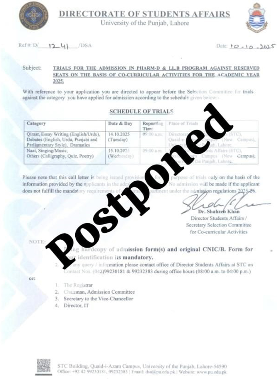 Postponement of Trials for the admission in Pharm-D & LL.B Program against reserved seats on the basis of Co-Curricular activities for the academic year 2025 |